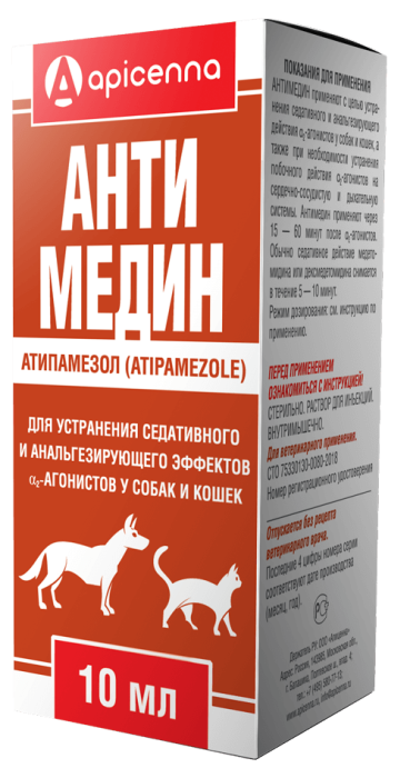 Антимедин - препарат для устранения седативного и анальгезирующего эффектов альфа-2-агонистов у собак и кошек. Антимедин вводят животным внутримышечно однократно. В случае продолжающегося угнетенного состояния у животного, возможно повторное введение Антимедина через 10 – 15 минут.