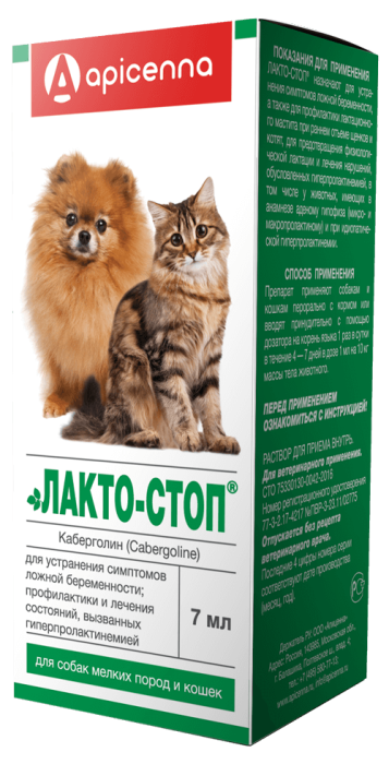 Лакто-Стоп подавляет лактацию, предотвращает увеличение молочных желез и профилактирует раз- витие лактационного мастита. Снижение уровня пролактина способствует быстрому исчезновению при- знаков ложной беременности у животного.