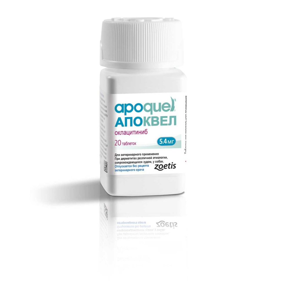в 1 таблетке в качестве действующего вещества оклацитиниба малеат (в пересчете на оклацитиниб) 5,4 мг, а также вспомогательные вещества: микрокристаллическую целлюлозу, лактозы моногидрат, карбоксиметил-крахмал натрия, магния стеарат, плёнкообразователь «Opadry II White» и воду очищенную.