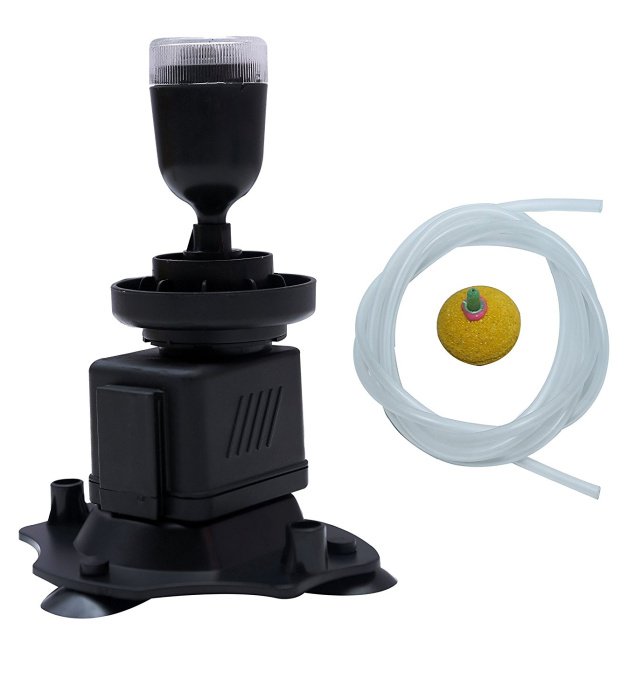 Распылитель воздуха в виде круглого аэрационного камня с подсветкой из четырех светодиодов высокой яркости обеспечивает очень красочный эффект подводного вулкана, из кратера которого поднимаются вверх цветные пузырьки воздуха, образующие мягкое свечение.