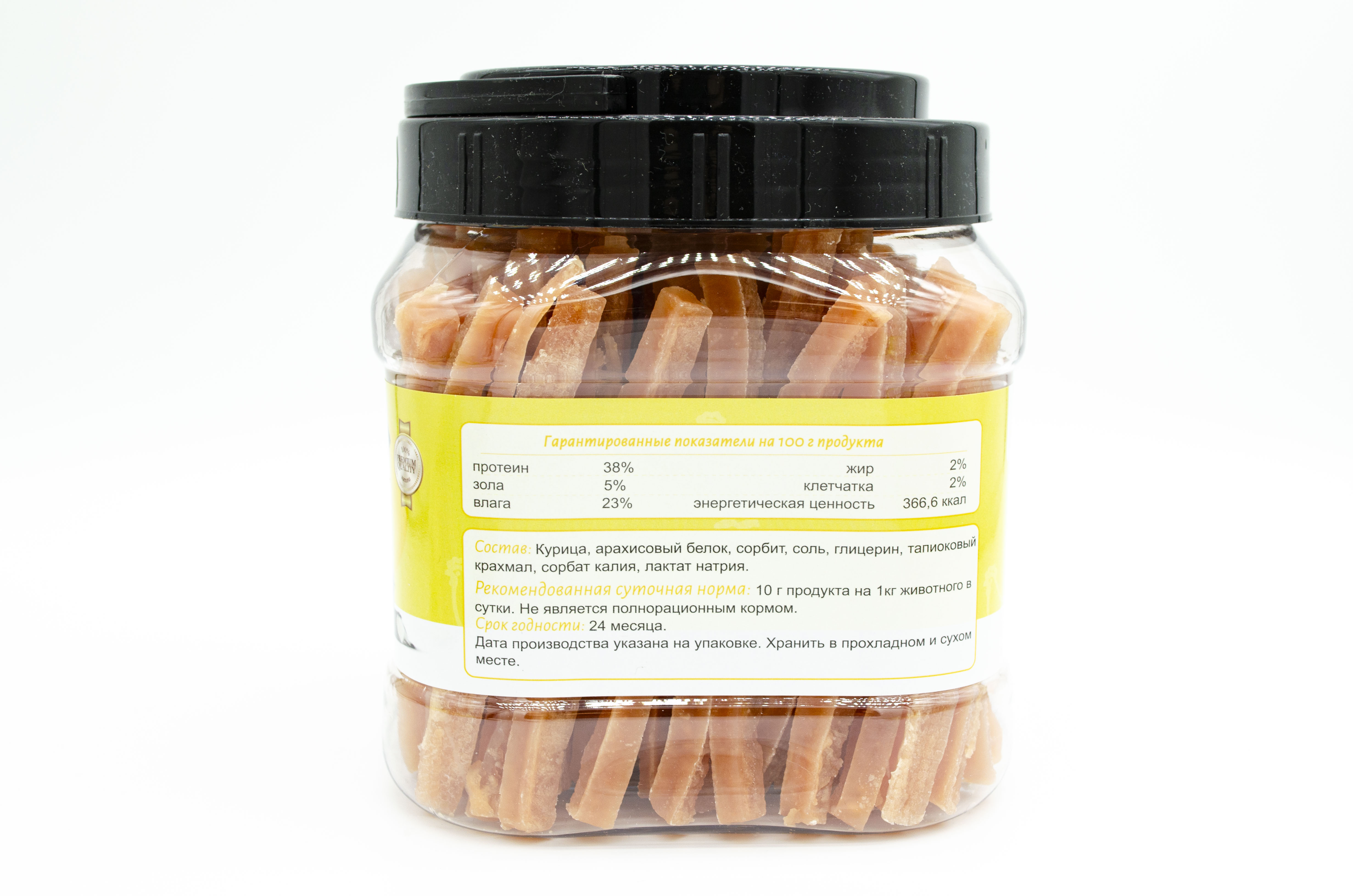 Курица, арахисовый белок, сорбит, соль, глицерин, тапиоковый крахмал, сорбат калия, лактат натрия.