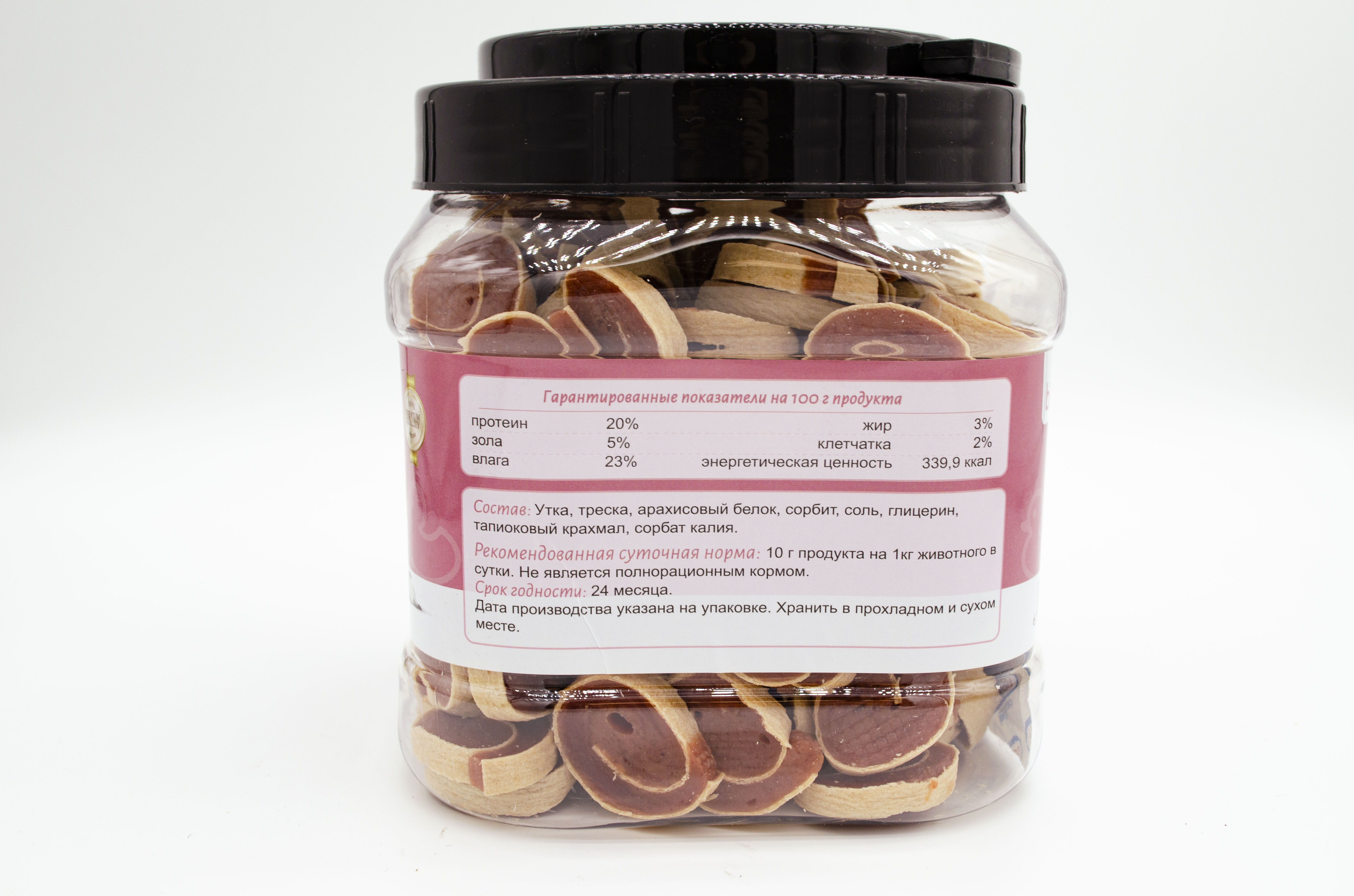 Утка, треска, арахисовый белок, сорбит, соль,; глицерин, тапиоковый крахмал, сорбат калия.
