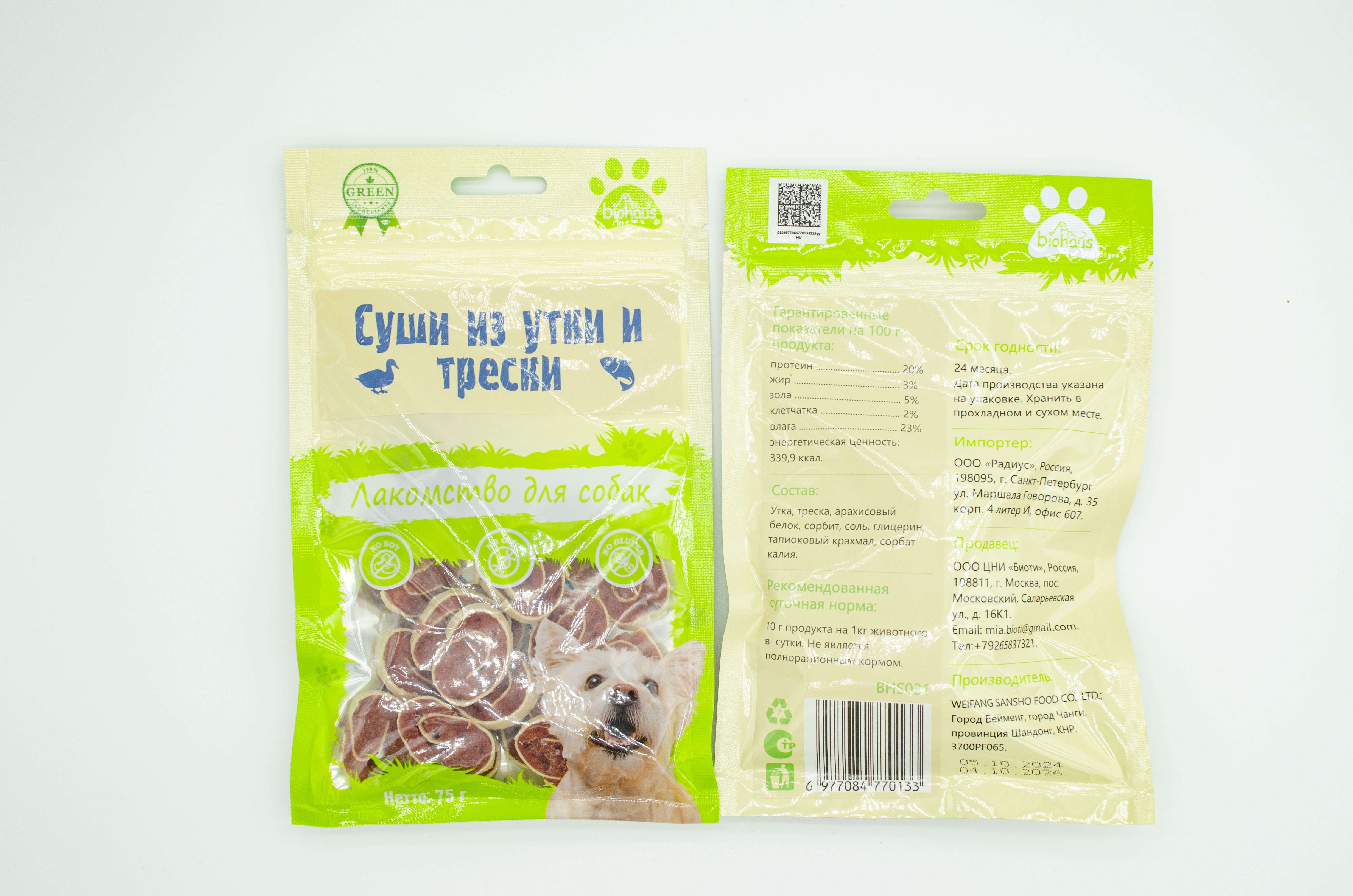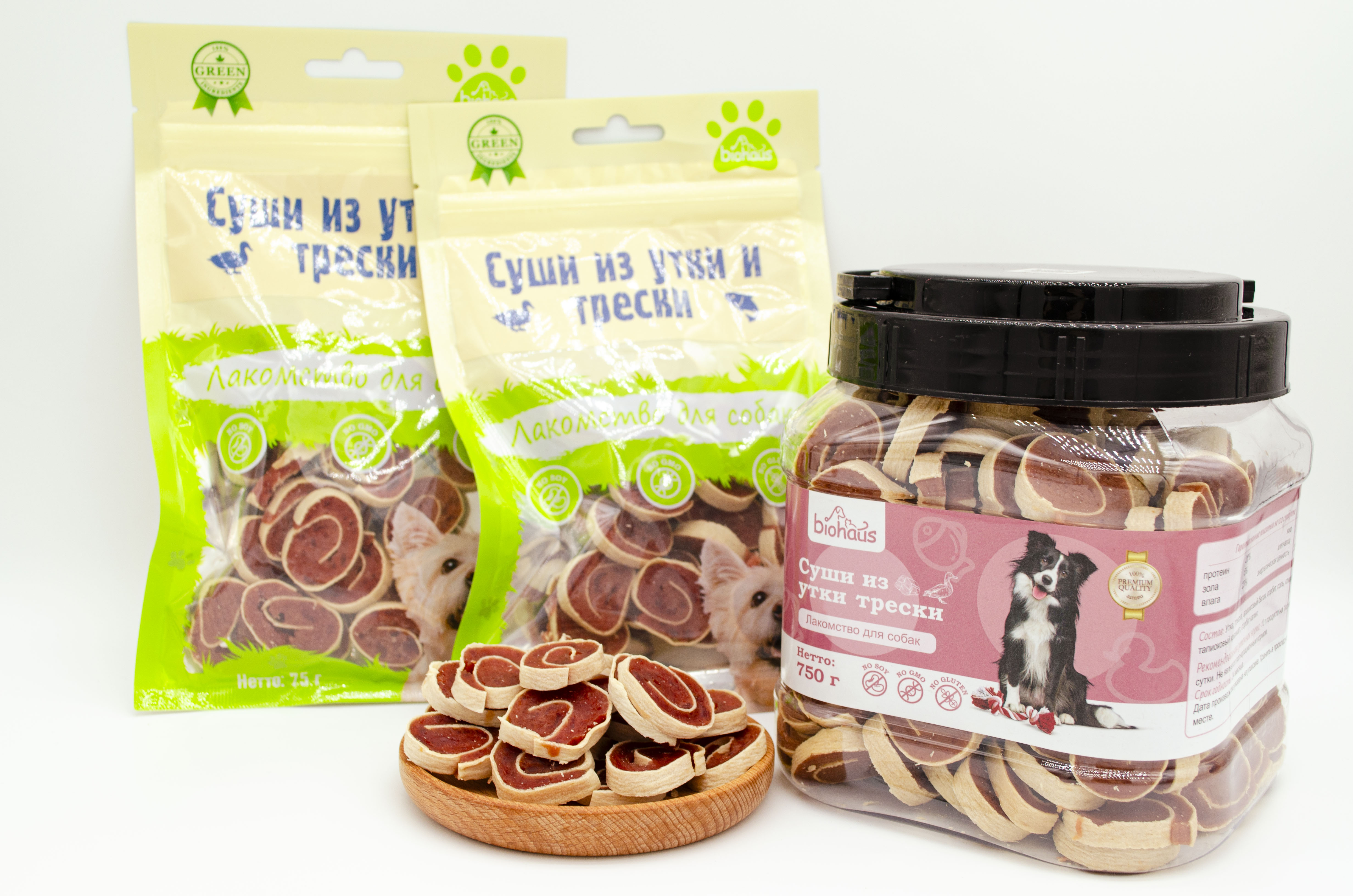 утка, треска, арахисовый белок, сорбит, соль, глицерин, тапиоковый крахмал, сорбат калия.
