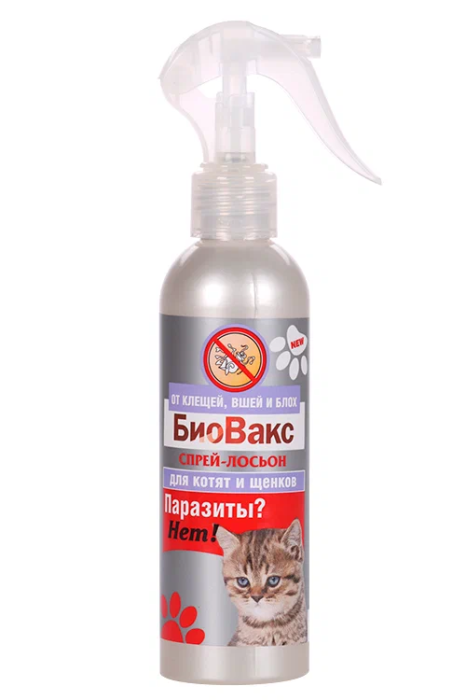 Спрей-лосьон «БиоВакс. Паразиты? Нет!» -для уничтожения блох; зудневых клещей и других паразитов у вашей кошки или щенка. Применение: тщательно встряхните флакон. С расстояния 10-15 см; наносите состав на шерсть спины; шеи; максимально увлажняя те части тела; до которых кошка не сможет добраться. Для увеличения результата рекомендуем кончиками пальцев; слегка втирая лосьон. После обработки расчешите шерсть и подсушите феном.