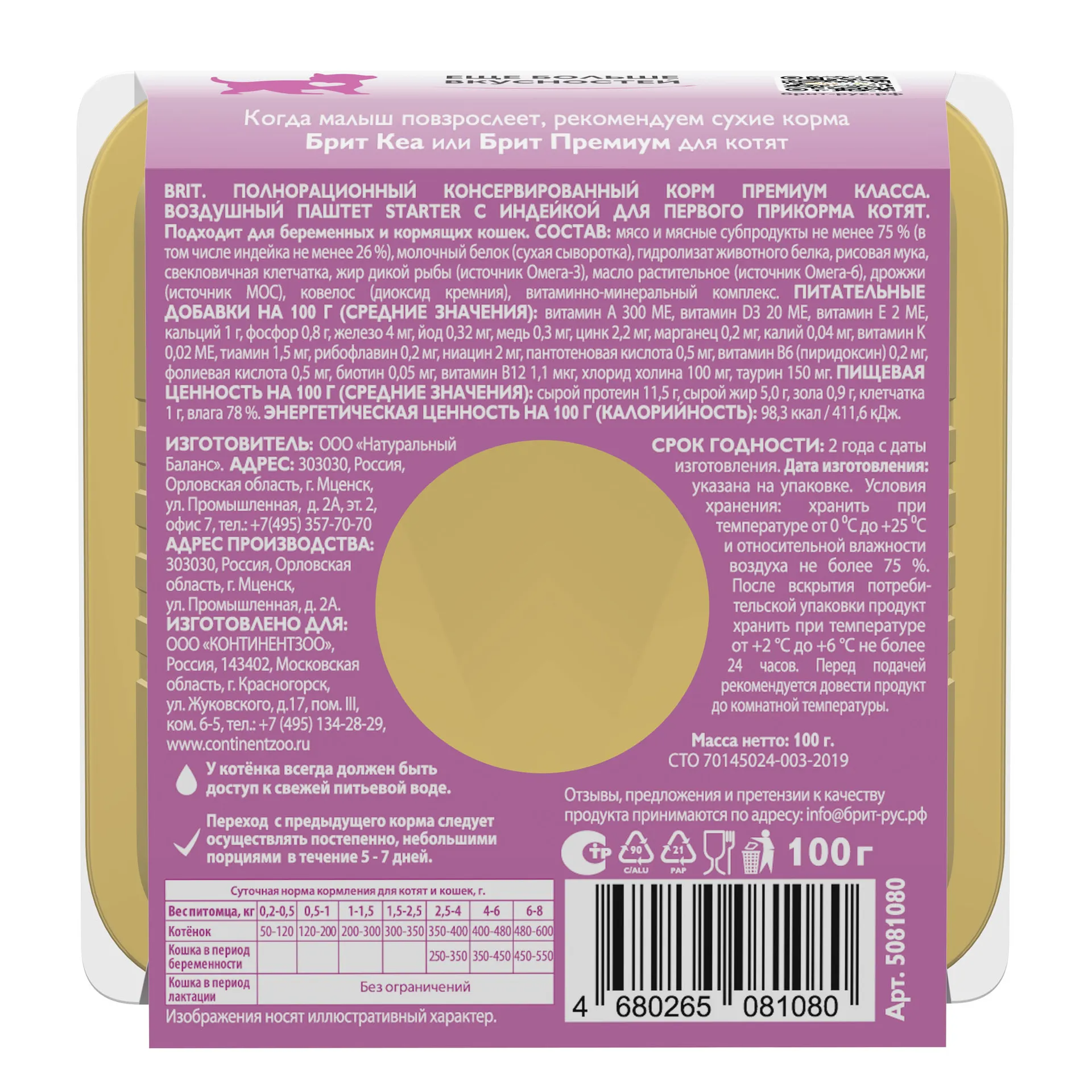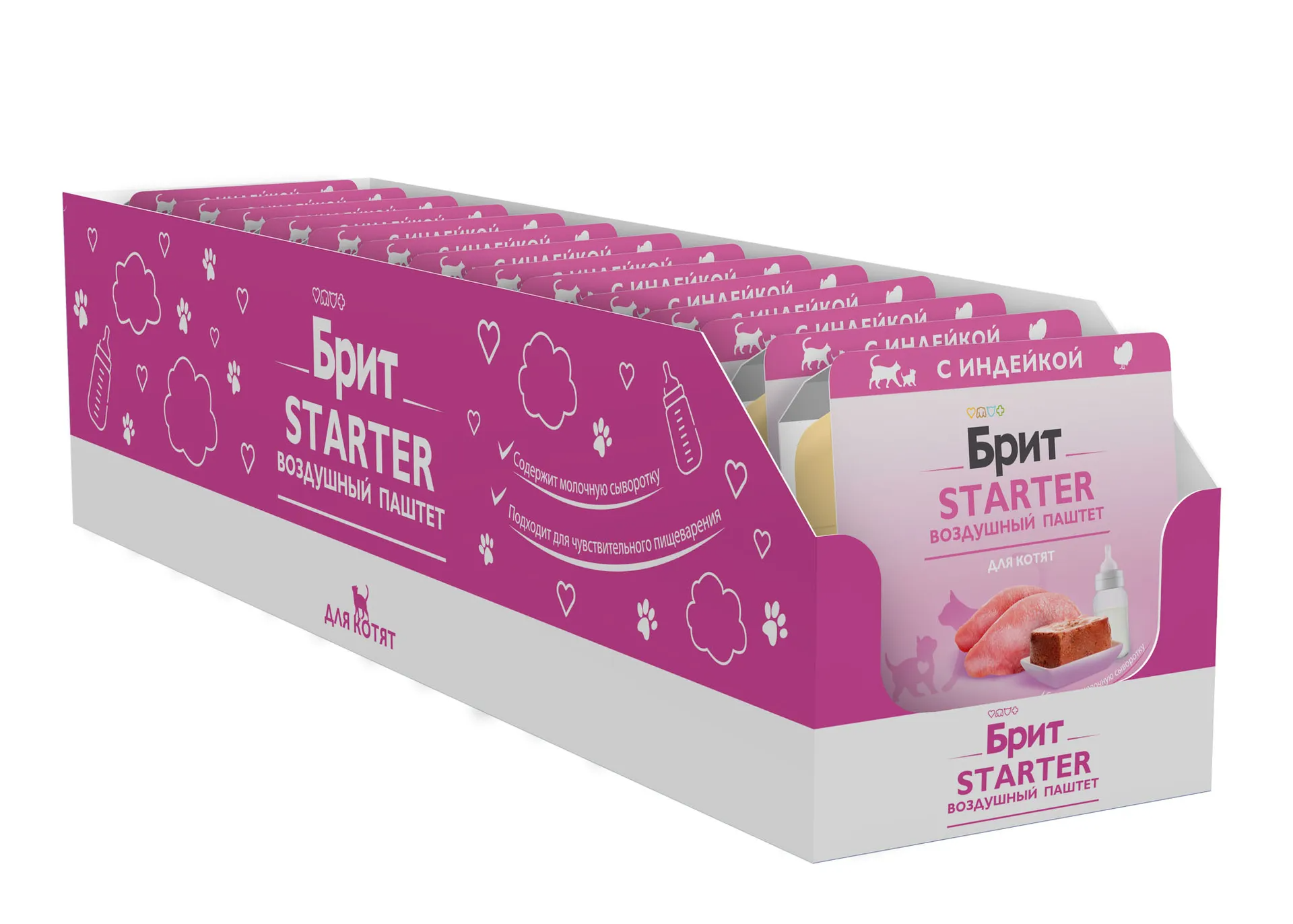 Нежный воздушный паштет BRIT STARTER создан специально для малышей и является идеальным вариантом для первого прикорма и приучения котят к взрослой пище. Сбалансированный состав корма содержит не менее 75 % мяса и мясных субпродуктов, витамины и минералы для крепкого иммунитета, легкоусвояемой молочный белок в виде безлактозной сухой сыворотки и гидролизат животного белка, обогащающий корм незаменимыми аминокислотами, необходимыми для роста и развития. STARTER BRIT обладает идеальным балансом Омега-6 и Омега-3 жирных кислот, необходимых для построения тканей организма. Рисовая мука работает как гастропротектор, облегчая пищеварение, а соединение кремния – ковелос – как энтеросорбент, уменьшая болезненное газообразование и нейтрализуя патогенную микрофлору. Корм содержит пребиотический комплекс, который помогает котятам быстрее привыкнуть к питанию взрослой пищей. Паштеты упакованы в ламистер — алюминиевую упаковку нового поколения, что означает герметичность, безопасность, простоту вскрытия и легкий вес.