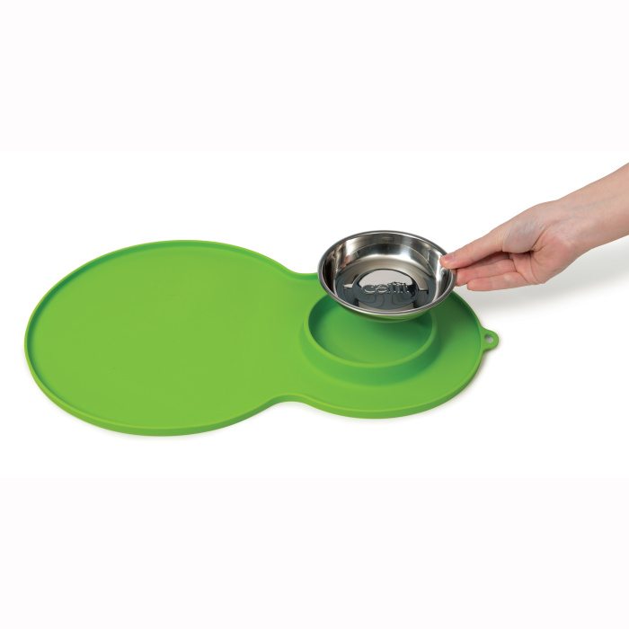 Эластичный мат с бортиком. Включает кормушку, выполненную из нержавеющей стали, пригодной для посудомоечной машины. Неглубокая форма, исключает негативное воздействие на усы при кормлении. Возможно подвешивание для сушки или хранения. Защищает напольные покрытия и столешницы от попадания на них корма и жидкости. С противоскользящим покрытием. Превосходно комбинируется с питьевыми фонтаниками Catit и кормушками Catit