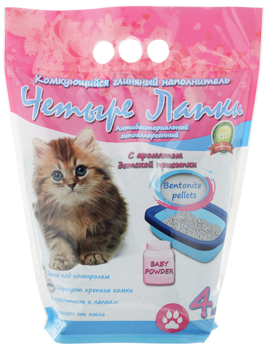 Наполнитель для кошачьих туалетов "Четыре лапки" - это 100% натуральный комкующийся наполнитель. Изготовлен из природной бентонитовой глины и является профессиональным комкующимся наполнителем премиум класса. Смесь состоит из мелких гранул, которые проходят специальный процесс сушки. Наполнитель "Четыре лапки" впитывает большое количество влаги, мгновенно образуя трудноразбиваемные комочки, а оптимальный размер гранул обеспечивает чистоту лапок и шерсти. Содержит аромат детской присыпки.
