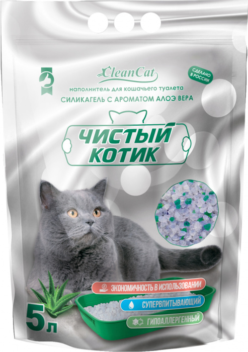 Силикагелевый наполнитель «Чистый котик» с ароматом АЛОЕ ВЕРА - отличается мгновенным и мощным влагопоглощением, а также высокой блокировкой запаха. В ходе специальной обработки производных кремния (натурального природного вещества) получается продукт с многопористой внутренней структурой и нулевой влажностью. В данном наполнителе из дробленого силикагеля используются только крупные частицы самого высокого качества, что положительно сказывается на безопасности Вашей кошки – не застревает в лапках, невозможно пораниться. Продукт экологически безвреден и безопасен при попадании в организм животного. Частицы силикагеля очень прочные, не размягчаются под воздействием влаги и работают в десятки раз дольше, чем обычный наполнитель. Он не пылит, не прилипает к шерсти и не разносится по дому, а легкий аромат алое вера, который активируется при соприкосновение с жидкостью, добавляет приятное ощущение свежести. Обладает бактерицидными свойствами и препятствует размножению болезнетворных бактерий и организмов.