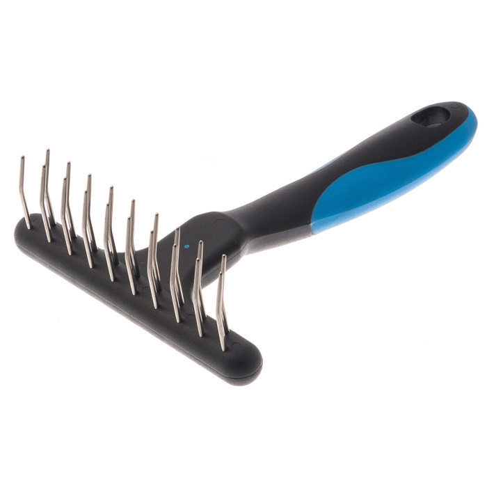 Грабли удаляют старую шерсть, грязь и предотвращают скатывание шерсти. Подходят для всех видов шерсти. Перед расчесыванием сильно спутанной шерсти используйте колтунорез, разделите шерсть на несколько участков. Расчесывание следует начинать с концов к корням шерсти. Регулярно удаляйте с граблей выпавшую шерсть. Материал: сталь, пластик, резина.