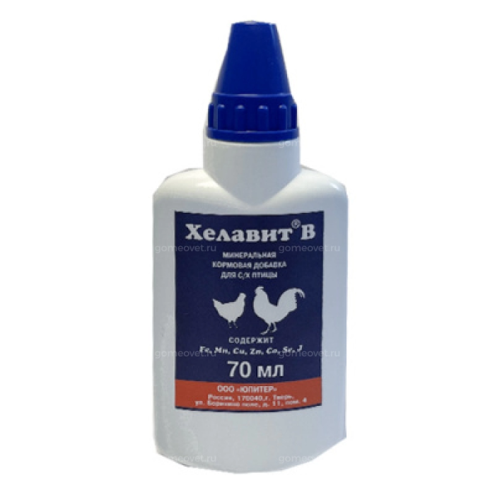 Хелавит В (Helavit В) - добавка кормовая минеральная для обогащения рационов сельскохозяйственной птицы с целью повышения яйценоскости. Хелавит В - представляет собой комплекс этилендиаминдиянтарной кислоты и лизина с железом, марганцем, медью, цинком, кобальтом, селеном и йодом в виде водного раствора. По внешнему виду Хелавит В представляет собой раствор темно-коричневого цвета, без запаха хорошо растворим в воде и нерастворим в орга-нических растворителях.