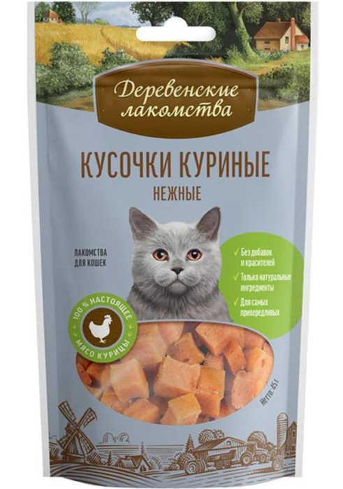 В основе "Деревенских лакомств" лежат традиции поощрения домашних питомцев, совмещенные с современными знаниями в области ветеринарии и здорового питания животных. Натуральные лакомства для кошек изготовлены с учетом сбалансированного питания из качественных, безопасных и тщательно подобранных ингредиентов, обогащены витаминами и минералами. Лучшие мясные и рыбные продукты в идеальном сочетании с полезными пищевыми добавками: витамином Е, таурином и рыбьим жиром - главный принцип, которому мы следуем в рецептах лакомств и кормов для кошек. Сочные куриные кусочки можно использовать как поощрение за правильное поведение, а также во время игр или дрессировки.