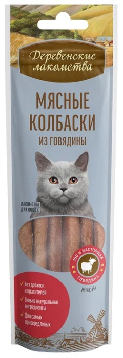 Лакомство Деревенские лакомства для кошек, мясные колбаски из говядины, 45 г. Лакомство Деревенские лакомства для кошек, мясные колбаски из говядины, 45 г. Классический насыщенный вкус, высокие питательные свойства настоящего мяса говядины что может быть лучше для любимой кошки. Вес (нетто): 45 г