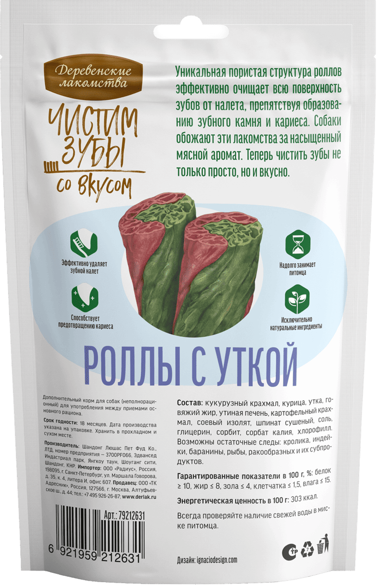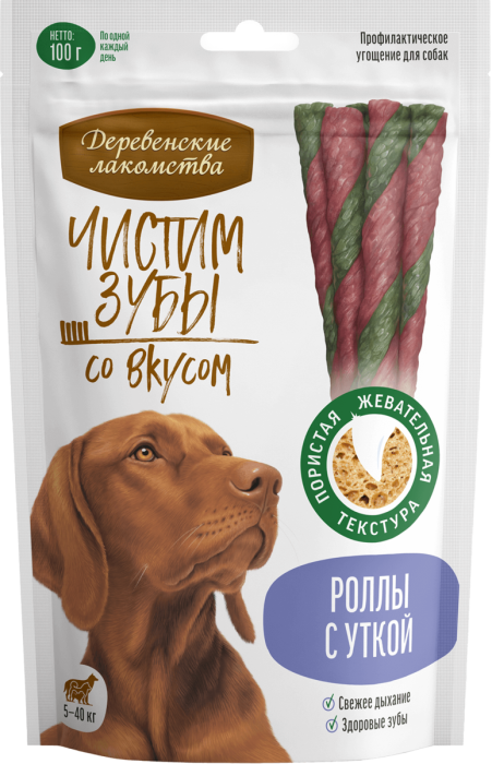 Уникальная пористая структура роллов с уткой эффективно очищает всю поверхность зубов от налета, препятствуя образованию зубного камня и кариеса. Собаки обожают эти лакомства за насыщенный мясной аромат. Теперь чистить зубы не только просто, но и вкусно! Лакомство предназначено для взрослых собак всех пород.
