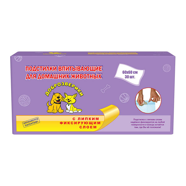 —Доброзверики Подстилки впитывающие для животных, с липким фиксирующим слоем 60х60 см,