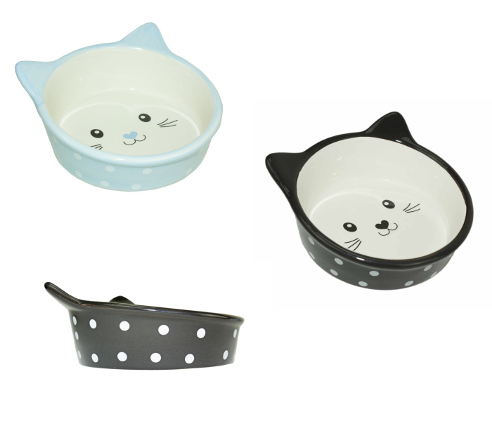 Керамическая мисочка в оригинальный горошек с кошачьей мордочкой внутри. Может использовать как для сухого/влажного корма, так и для воды.
