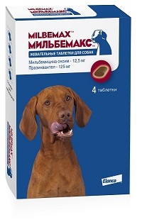 Мильбемакс жевательные таблетки для собак 12,5/125 мг (мильбемицина оксим, празиквантел), таблетки для орального применения, по 4 таблетки в блистерах, №1