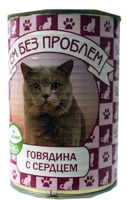 Ем Без Проблем - Говядина с серцем для кошек. Натуральный консервированный мясной корм Ем Без Проблем для кошек. Изготовлен из натурального российского мяса. Не содержит сои, консервантов, ароматизаторов, ГМИ.