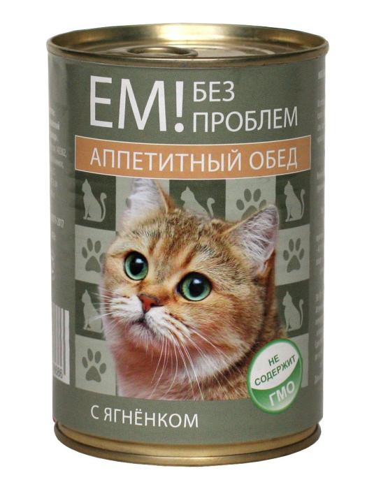 "Ем без проблем" - высококачественные корма для собак и кошек по оптимальной цене. По своим органолептическим свойствам продукт не уступает лучшим российским аналогам. Корма содержат 60 … 75% мясных продуктов от своего объема. Корма для кошек «ЕМ БЕЗ ПРОБЛЕМ Аппетитный обед». Внешний вид продукта - мясные кусочки в соусе. Это наиболее востребованная у кошек консистенция корма. Продукт имеет высокие показатели поедаемости, которые достигнуты за счет применения свежих, высококачественных мясных компонентов. Производство влажных кормов ведется по тем же нормам и санитарно-гигиеническим правилам, что и консервы для людей. Все мясное сырье проходит государственный ветеринарный контроль, а готовая продукция подвергается испытаниям на микробиологическую безопасность. В производстве используется мясное сырье с ветеринарным удостоверением "свободная реализация" (мясное сырье пригодно для реализации населению через магазины).