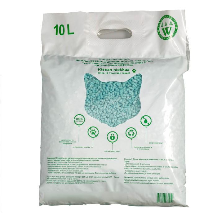 В отличии от прессованных древесных гранул, разваливающихся в труху при попадании влаги, гранулы из целлюлозно-минеральной композиции производятся по другой технологии, гранулы имеют витую волокнисто-капиллярную структуру, набухают при попадании влаги, но сохраняют целостную форму, не разносятся из лотка.