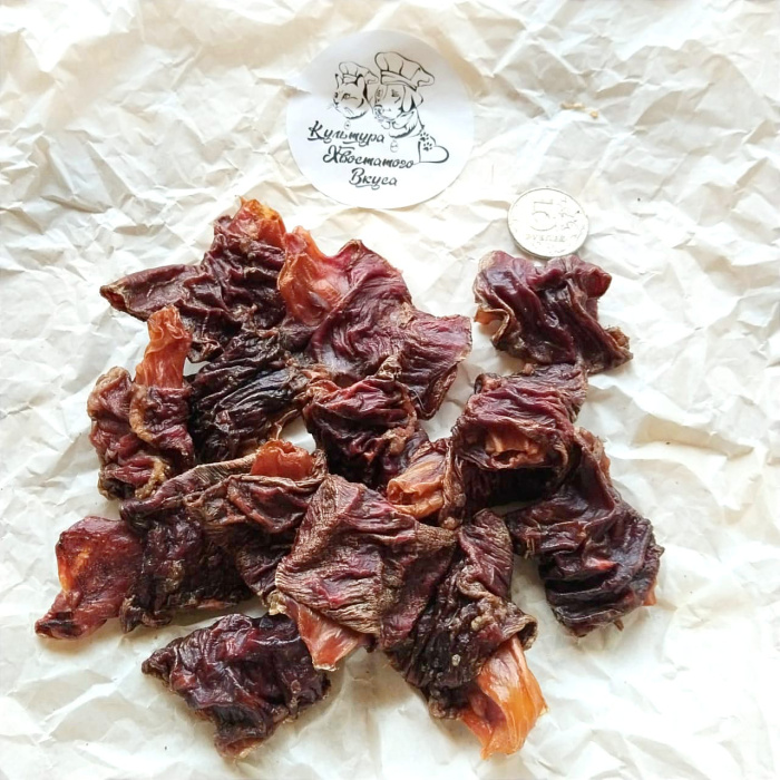 Пожалуй, ни один другой субпродукт для собак, не может похвастать таким высоким содержанием аминокислот, коллагена, микроэлементов. Мясо пищевода не похоже на обычное мускульное. Это трубка жвачного животного, через которую пища попадает в желудок, в высушенном виде представляет собой достаточно твердое лакомство, которое собаки обожают грызть часы напролет. Пищевод не вызывает аллергии и подходит всем собакам (можно угощать собак аллергиков), как любимая и иногда единственная радость.