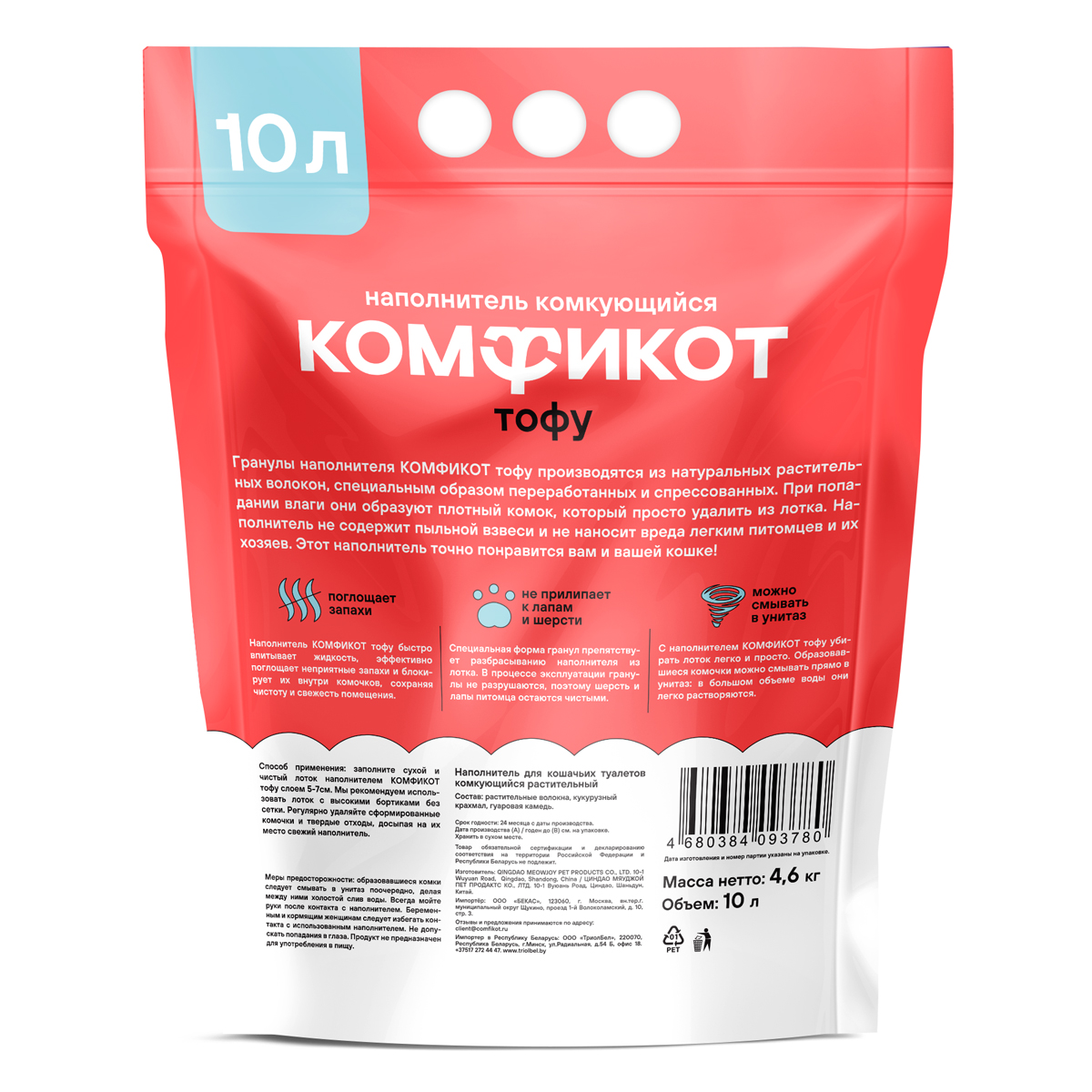 Наполнитель КОМФИКОТ тофу быстро впитывает жидкость, эффективно поглощает неприятные запахи и блокирует их внутри комочков, сохраняячистоту и свежесть помещения. Специальная форма гранул препятствует разбрасыванию наполнителя из лотка. В процессе эксплуатации гранулы не разрушаются, поэтому шерсть и лапы питомца остаются чистыми. С наполнителем КОМФИКОТ тофу убирать лоток легко и просто. Образовавшиеся комочки можно смывать прямо в унитаз: в большом объеме воды они легко растворяются. Способ применения: заполните сухой и чистый лоток наполнителем КОМФИКОТ тофу слоем 5-7 см. Мы рекомендуем использовать лоток с высокими бортиками без сетки. Регулярно удаляйте сформированные комочки и твердые отходы, досыпая на их место свежий наполнитель. Состав: растительные волокна, кукурузный крахмал, гуаровая камедь. Масса нетто: 4,6 кг. Объем: 10 л.