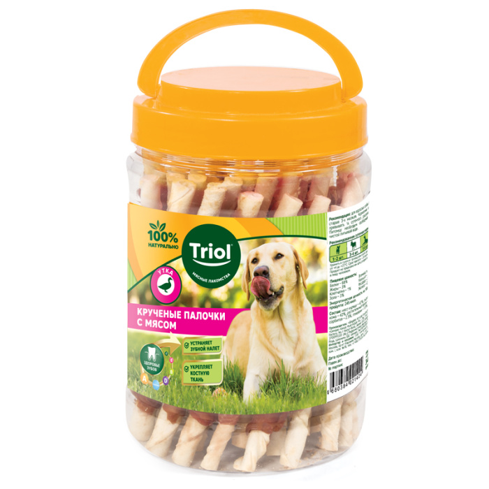 Крученые палочки с уткой – это полезное угощение для профилактики зубного камня, здоровья структуры костных тканей и обеспечения функциональности кровообращения, обогащенное кальцием, фосфором и железом. Палочки расфасованы в пластиковые банки, благодаря чему потребитель может выбрать: покупать целую банку или поштучно. Банку с эргономичной ручкой удобно хранить и легко транспортировать. Вес нетто 340г.