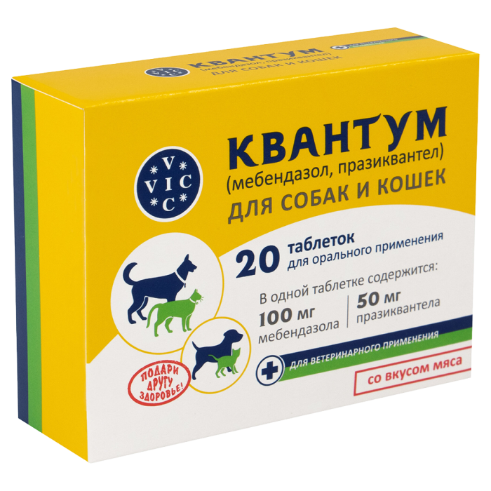 Квантум применяют животным индивидуально, однократно, в утреннее кормление с небольшим количеством корма, без предварительной голодной диеты и применения слабительных средств, в дозе 1 таблетка на 10 кг массы животного, что соответствует: