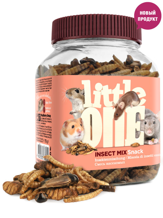 Смесь насекомых является вкусным и питательным дополнительным кормом для всеядных грызунов, а также ценным источником важных макро- и микронутриентов. Ее состав идеально сбалансирован и включает в себя сушеные куколки тутового шелкопряда, личинки мухи чёрной львинки, мучных червей и сверчков.