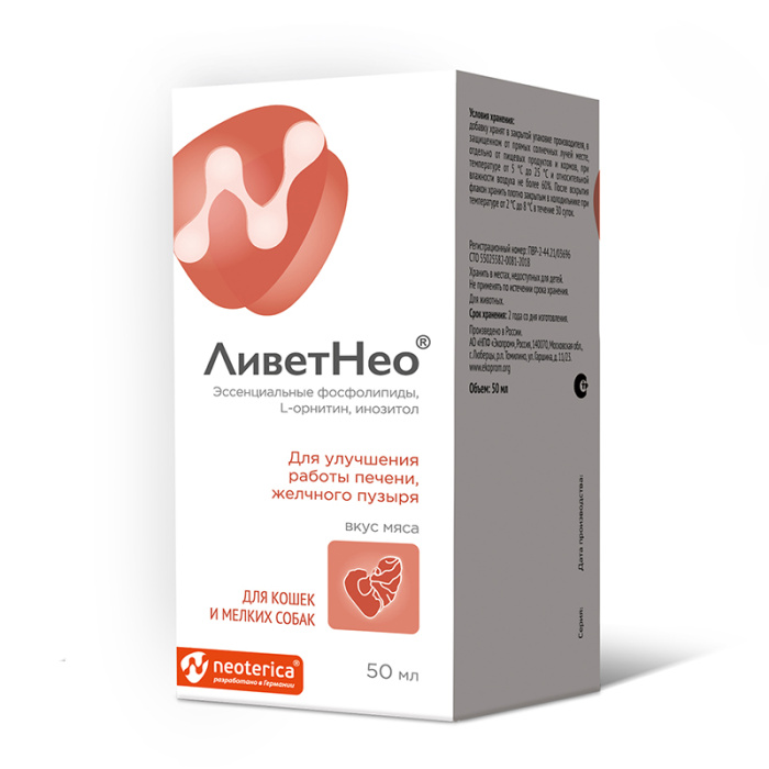 ЛиветНео – кормовая добавка для нормализации и улучшения работы печени, желчного пузыря на основе эссенциальных фосфолипидов с приятным ароматом и вкусом мяса.