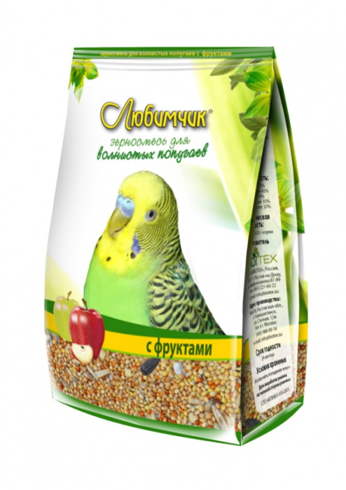 "Любимчик ФРУКТЫ" корм с добавлением сухофруктов для волнистых попугаев. Поддерживает естественную флору кишечника и значительно разнообразит рацион вашего ЛЮБИМЧИКА.