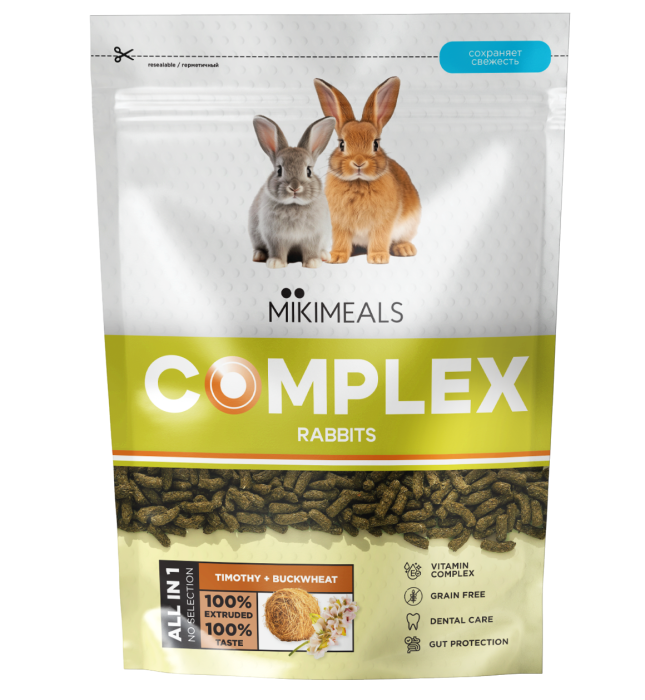 MIKIMEALS COMPLEX для кроликов - это полноценный, обогащенный витаминами, вкусный корм, приготовленный для Ваших питомцев методом экструзии, что существенно повышает усвояемость готового продукта и входящих в его состав ингредиентов, а также улучшает питательную ценность и гарантирует предотвращение развития в составе корма вредных микроорганизмов.