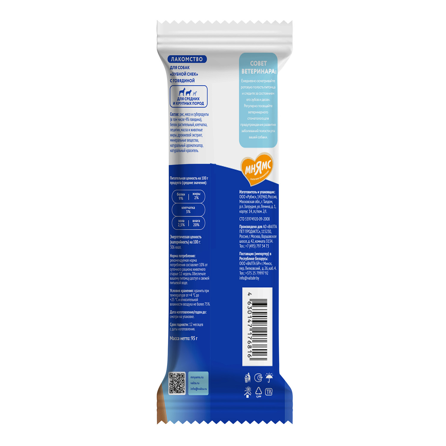 Мнямс ДЕНТАЛ "Зубной снек"с говядиной – вкусное и полезное лакомство для взрослых собак крупных пород и щенков крупных пород старше 3-х месяцев. Обладает высокой вкусовой привлекательностью и прекрасной поедаемостью. Благодаря особой форме гарантирует тщательное очищение даже самых труднодоступных мест полости рта, предотвращает появление налета и обеспечивает профилактику появления зубного камня, обладает антибактериальным и освежающим действием, деликатно массирует десны.