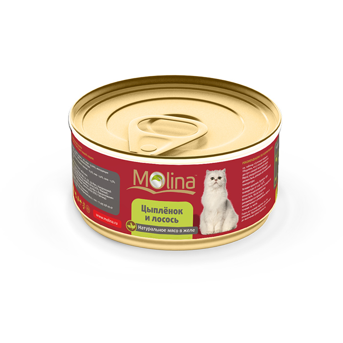 Консервы для кошек Molina Натуральное Мясо в Желе — Цыпленок и Лосось — это нежное и аппетитное, легко усвояемое угощение для взрослых кошек, состоящее из натурального мяса в ароматном желе. Корм содержит все необходимые компоненты, обеспечивающие организм питомца энергией, витаминами и минеральными веществам, необходимыми для здорового роста и развития. Консервы состоят исключительно из отборных натуральных компонентов и не содержат ГМО, сою, искусственные красители, консерванты и усилители вкуса.