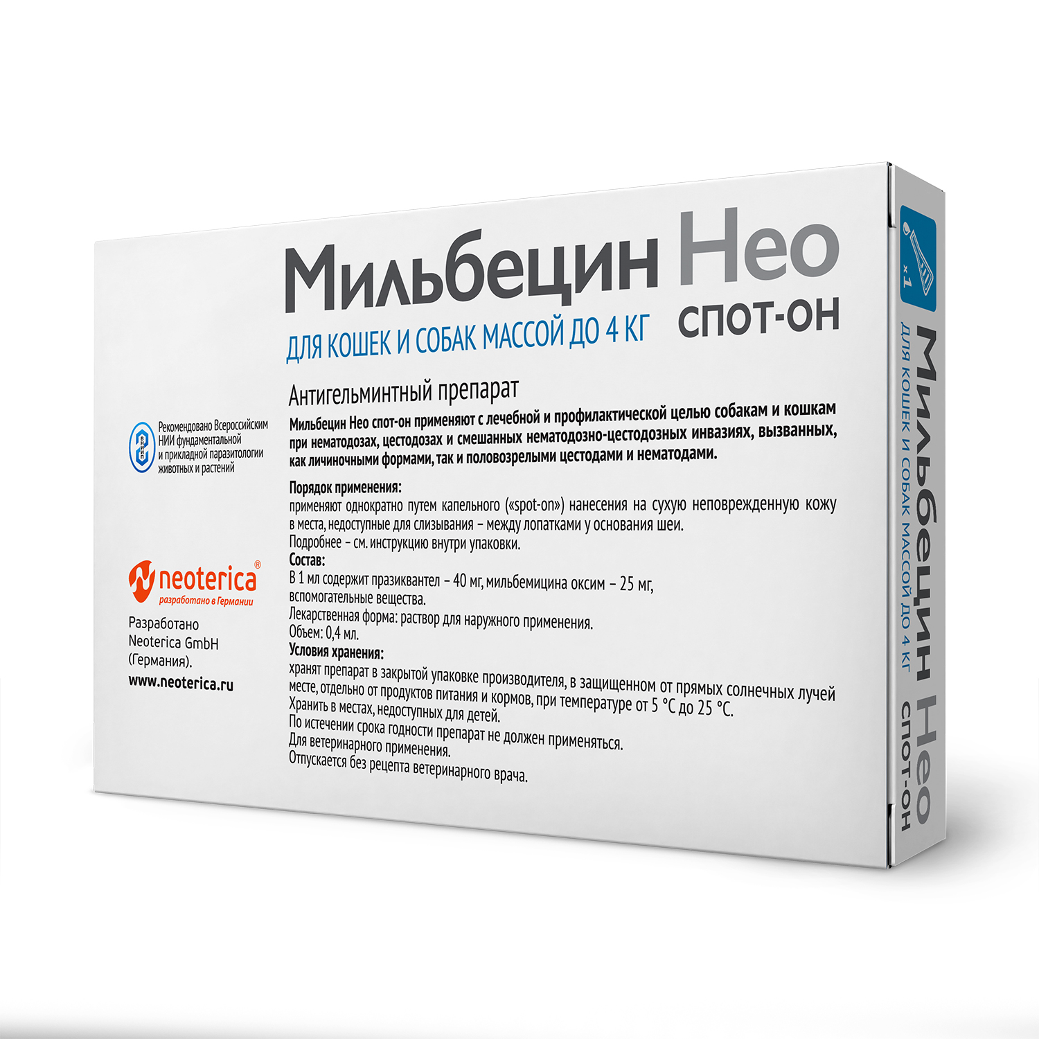 Мильбецин Нео Spot-on для кошек и собак - препарат широкого спектра действия. Давайте препарат однократно, как с профилактической, так и с лечебной целью. Капли действуют 1 месяц.
