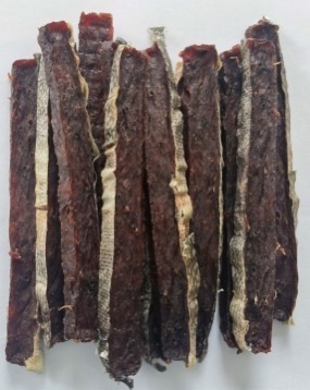 Говядина 84%, утка 8%, куриный хрящ 3%, треска 2%, глицерин 2,65%, соль 0,25%, сорбат калия 0,1%, пищевой краситель 0,0013% Белок 36%, Жир 2,5%, Клетчатка 2%, Зола 3,5%, Влажность 25%