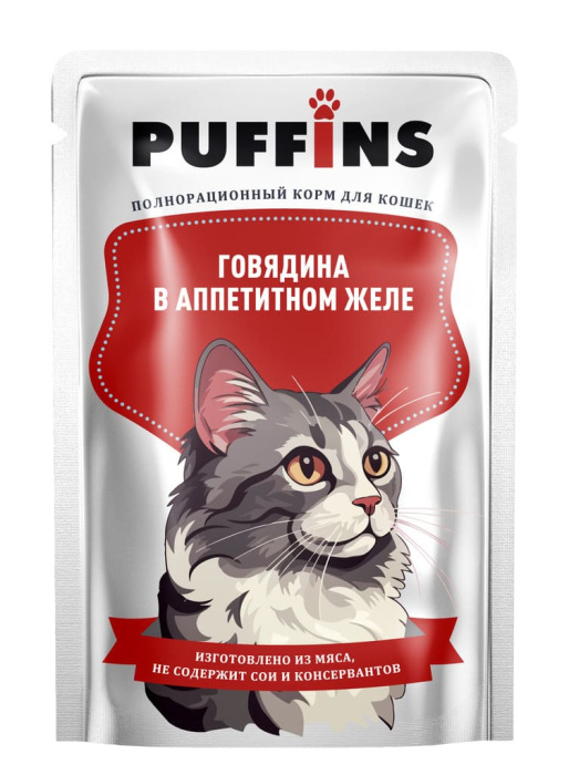 Пакет дой-пак для кошек «Puffins» — идеальный выбор для вашего пушистого друга! Этот влажный корм эконом класса представлен в удобной упаковке 75 гр и порадует вашего питомца вкусом нежных мясных кусочков в желе. Не содержит сои и консервантов, обеспечивая вашего кота или кошку всеми необходимыми питательными веществами.