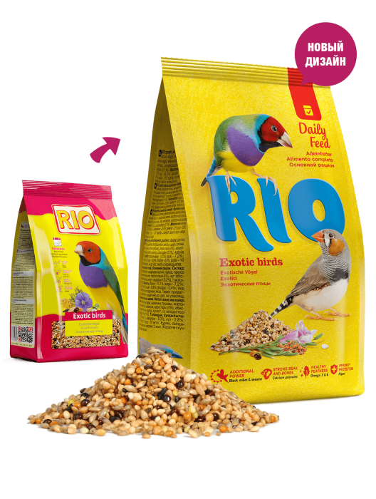 RIO корм для экзотических птиц. Основной рацион - тщательно сбалансированная зерновая смесь, в состав которой отобраны самые полезные и любимые амадинами, астрильдами и другими видами ткачиков зерна и семена. Их разнообразие обеспечит птицу всеми необходимыми питательными веществами.