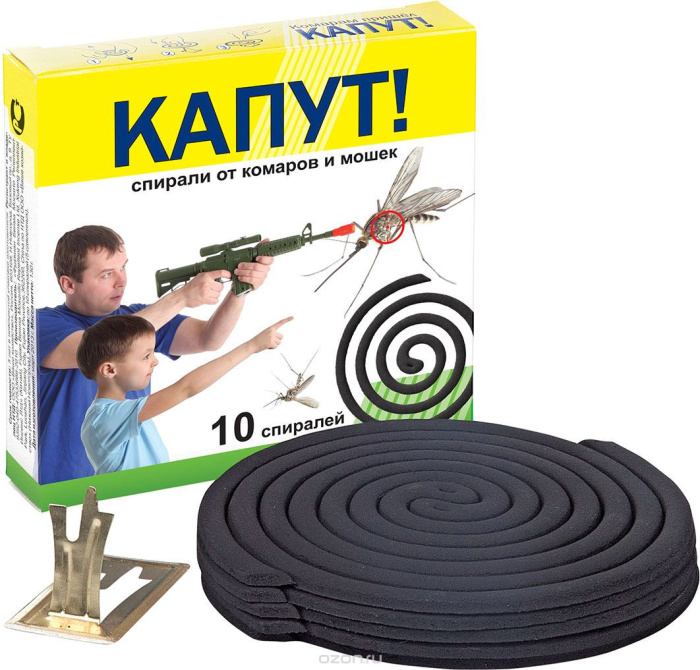 «Капут» — спирали от комаров и мошек. Для уничтожения комаров и других летающих насекомых(мошки, мокрецы, москиты) на открытом воздухе (сад, приусадебный участок, беседка, открытая терраса, веранда) в присутствии людей, а также в закрытых помещениях в отсутствие людей.