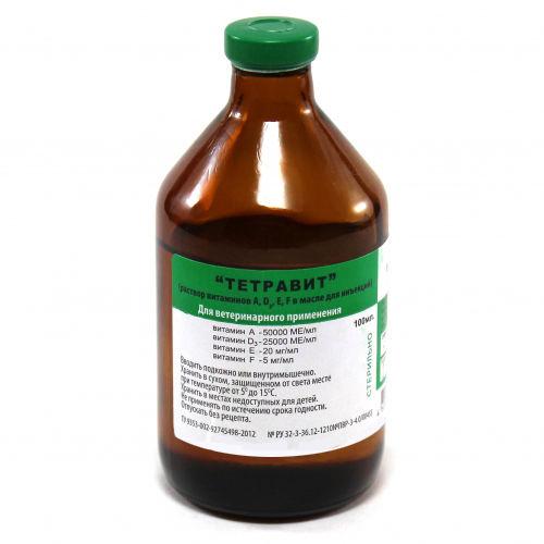 Тетравит является эффективным комбинированным витаминным препаратом, в котором витамины А, D3, Е и F являющиеся его составляющими компонентами приведены в строго обоснованных соотношениях, что позволяет препарату положительно воздействовать на многие процессы, протекающие в организме животных.Тетравит предназначен для восполнения в организме животных витаминов, что приводит к повышению сопротивляемости организма к инфекциям и усилению обмена веществ.