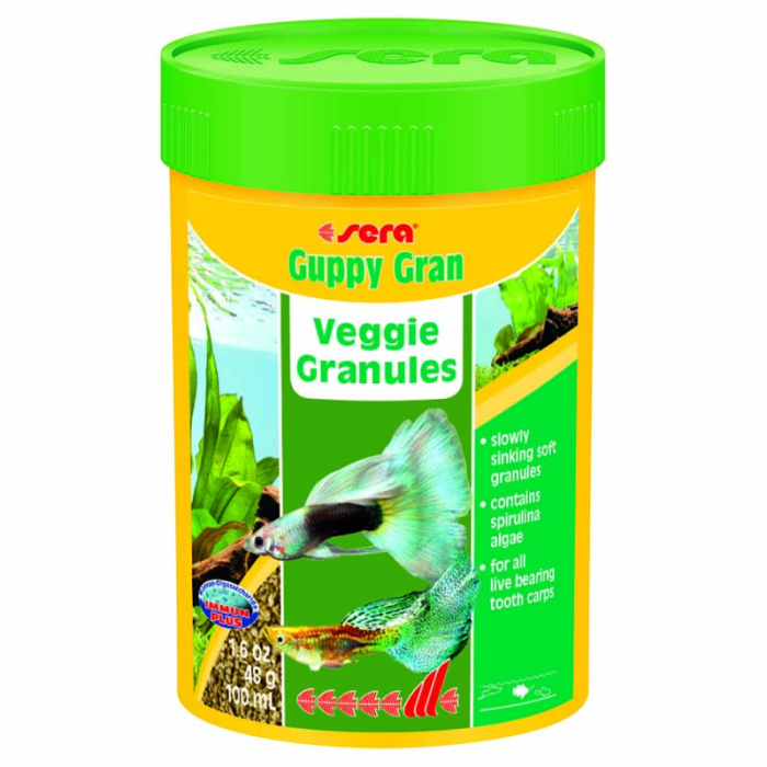 sera гуппи гран – растительный корм, состоящий из мягких гранул, произведенных путем бережной обработки сырья, предназначен для всех преимущественно растительноядных рыб, кормящихся в средних слоях воды. Тщательно подобранные ингредиенты корма, такие как водоросль спирулина, способствуют здоровому пищеварению и жизнестойкости рыб. Легко усваиваемый, энергетически богатый корм оптимально удовлетворяет потребности гуппи и других, особенно активных видов рыб. Медленно тонущие мелкие мягкие гранулы в воде быстро становятся эластичными, при этом надолго сохраняют свою форму, не загрязняя воду. Состав: кукурузный крахмал, пшеничная клейковина, рыбная мука, рыбий жир, измельченная спирулина, пивные дрожжи мука из зародышей пшеницы, травы, мука люцерны, мука из крапивы, мука из гаммаруса, мука из морских водорослей, петрушка, паприка, мука из шпината, морковь, мука из мидий, чеснок.