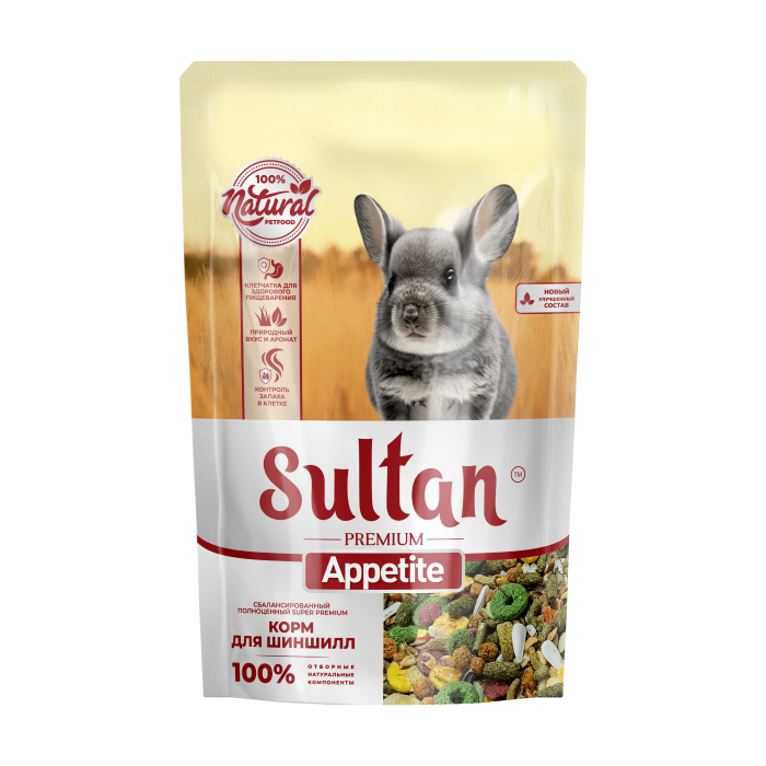 SULTAN BIO PREMIUM Appetite Натуральный многокомпонентный комплексный корм, изготовленный в соответствии с пищевыми потребностями шиншилл, живущих в домашних условиях и составлен так, что может восприниматься как угощение. Содержит все необходимые для поддержания здоровья вашего питомца питательные вещества, витамины, минералы и аминокислоты.