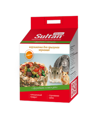 Зерновая Корзиночка Sultan – это вкусное лакомство для всех видов грызунов – хомяков, крыс, мышей и песчанок, кроликов, морских свинок, шиншилл. Корзиночка изготовлена и зерен злаковых культур с добавлением лугового сена. Наполнена сушеными овощами и фруктами.