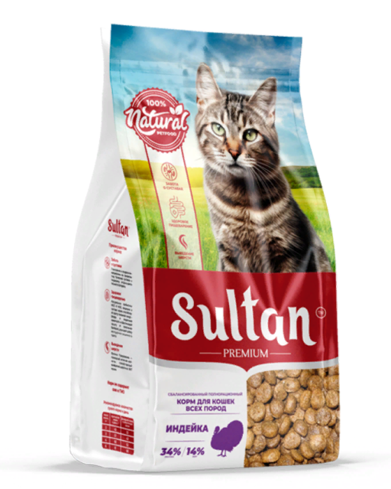 Полнорационный корм для стерилизованных кошек Султан «Индейка с клюквой» - сбалансированное питание для стерилизованных кошек и котов всех пород, изготовленный с учетом того, что стерилизованные кошки как правило, менее подвижны и склонны к набору веса, чтоувеличивает риск развития МКБ и проблем с суставами. В связи с этим рецепт корма содержит Глюкозамин и Хондроитин для здоровья суставов, клюкву, DL-метеонин, пониженный кальций и фосфор для профилактики мочекаменной болезни. Легкоусвояемый белок индейкиобладает высокой биодоступностью, благодаря чему кошка получает все необходимые питательные вещества. Корм содержит таурин — аминокислоту, играющую важную роль в поддержке остроты зрения и здоровья глаз кошки.