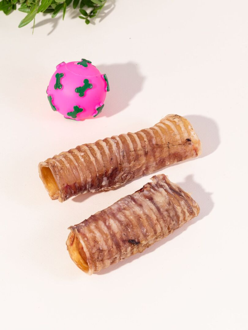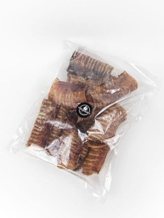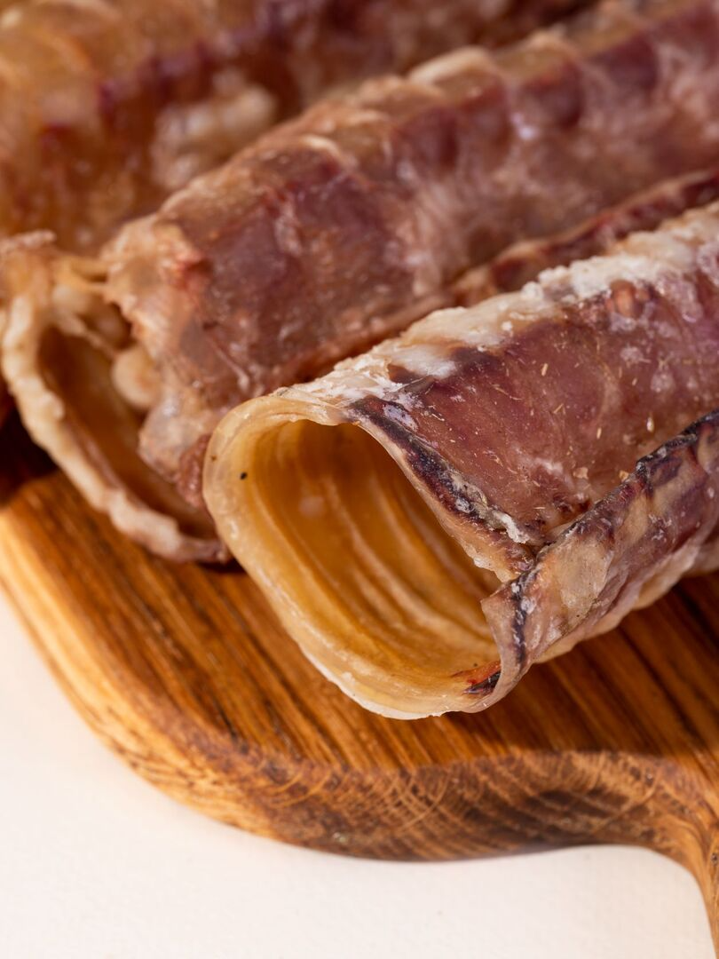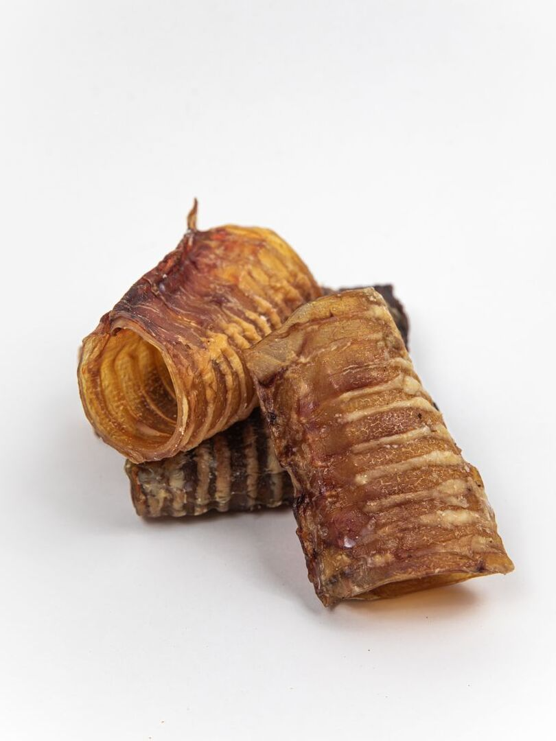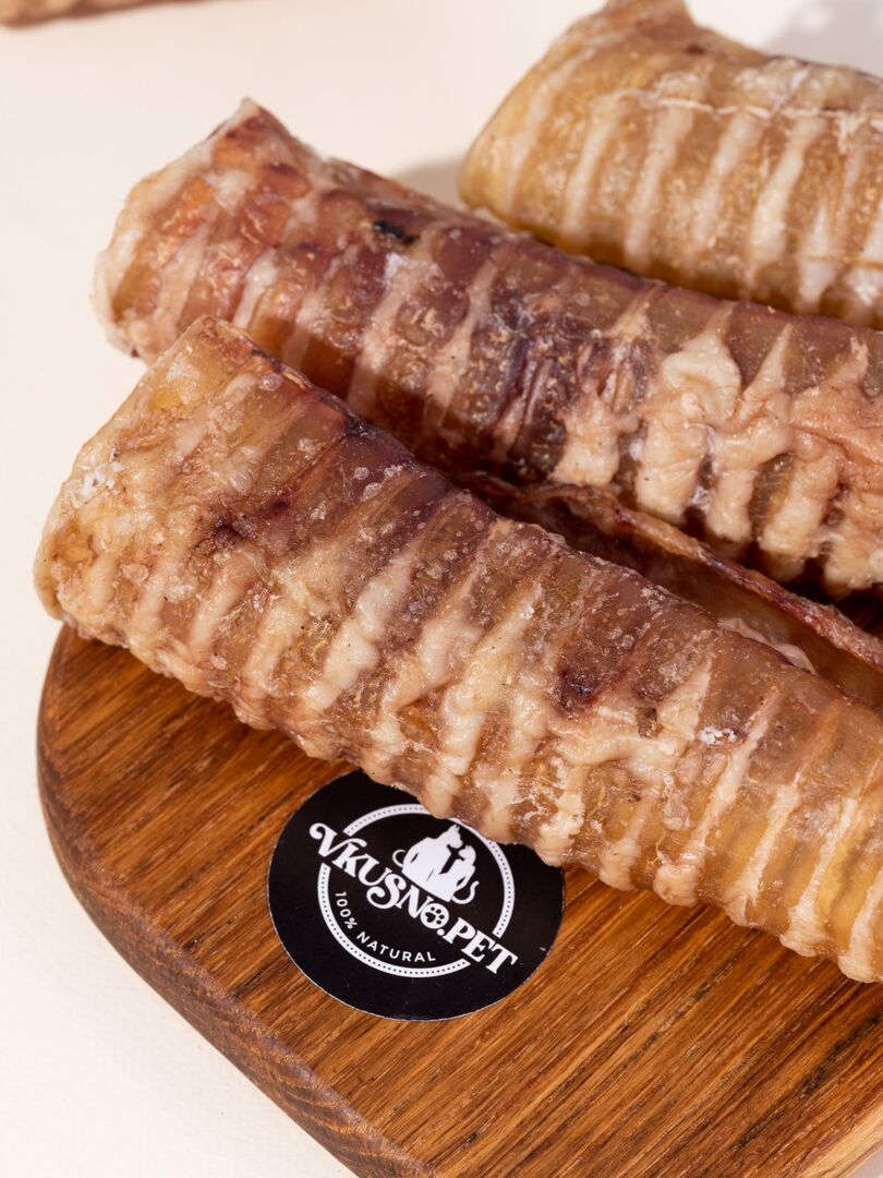 Сушеная трахея - ароматное, хрустящее на зубах лакомство, богатое хрящевой и соединительной тканью и высоким содержанием белка, фосфора, железа и цинка.