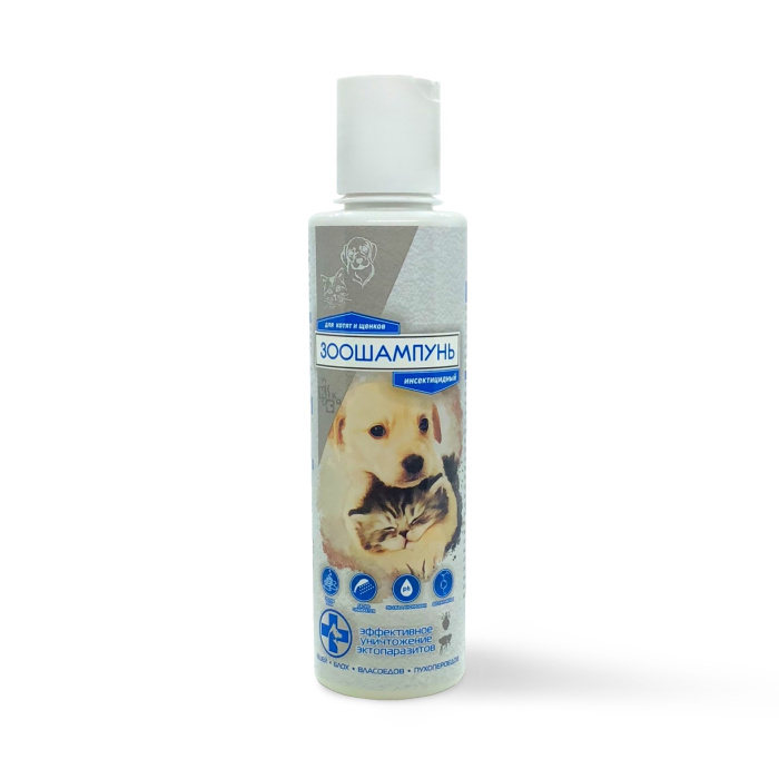 Раствор для лечения энтомозов у щенков и котят. Порядок применения: Перед обработкой кожно-волосяной покров животного обильно смачивают теплой водой, а затем наносят лекарственный препарат из расчета 0,5-1,0 мл на 1 кг массы животного, равномерно распределяют по всей поверхности тела, слегка втирают до образования пены, избегая попадания в глаза и предотвращая слизывание препарата животным. Через 5-7 минут препарат тщательно смывают теплой водой, шерсть расчесывают гребнем и высушивают. Повторные обработки проводят по энтомологическим показаниям.