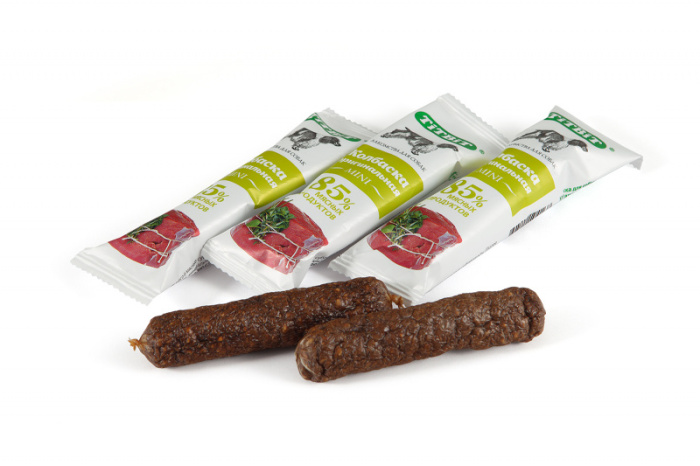 Колбаски для собак Бифф Мини. Изготовлены из говяжьего мяса и мясных субпродуктов по колбасной технологии "Biff". Натуральный продукт, который не содержит красителей и консервантов.