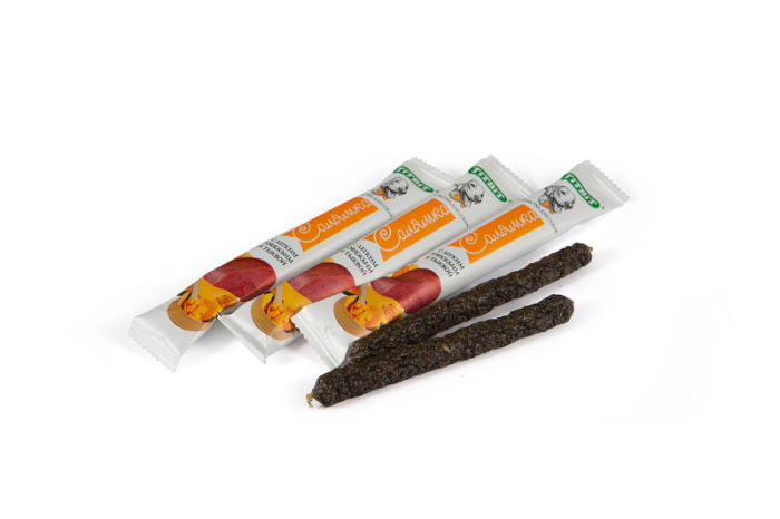 Колбаски для собак Бифф Салямка . Изготовлены из говяжьего мяса и мясных субпродуктов по колбасной технологии с добавлением таких полезных компонентов, как кукуруза, морковь и печень говяжья. Натуральный продукт, который не содержит красителей и консервантов.