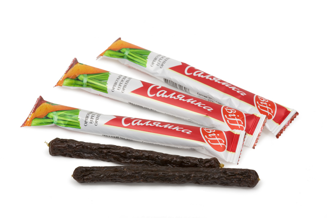 Колбаски для собак Бифф Салямка . Изготовлены из говяжьего мяса и мясных субпродуктов по колбасной технологии с добавлением таких полезных компонентов, как кукуруза, тыква и легкое говяжье. Натуральный продукт, который не содержит красителей и консервантов.