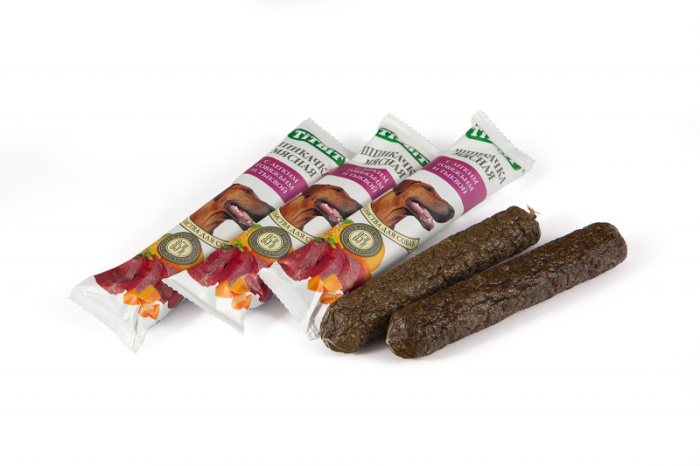 Колбаски для собак Бифф Шпикачка . Изготовлены из говяжьего мяса и мясных субпродуктов по колбасной технологии с добавлением таких полезных компонентов, как кукуруза, тыква и легкое говяжье. Натуральный продукт, который не содержит красителей и консервантов.
