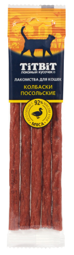 Золотая коллекция – это линейка лучших лакомств TITBIT, разработанных при участии владельцев домашних животных и их питомцев. Колбаски «Посольские» приготовлены из тщательно отборной говядины. Вкусовая палитра лакомства дополнена нежным куриным филе. Эти колбаски станут прекрасным угощением для вашего питомца.